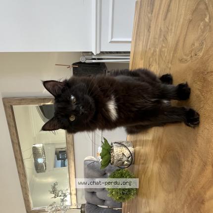 Cherry à six mois elle est toute noire avec une tache blanche sous le cou et une longue queue en panache. Elle est sortie avec sa sœur pendant l’orage, elle n’est pas rentrée. Nous sommes à côté du golf Sainte Rose