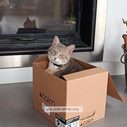 Chat blanc et gris tigré. Très sociable. Il a un collier orange avec une clochette