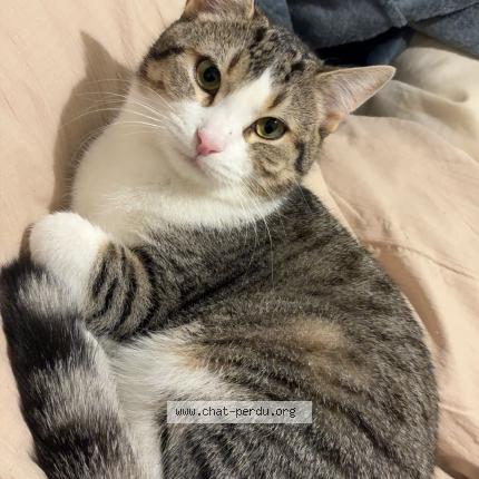Chat de gouttière perdu dans les alentours de la résidence aux 11, avenue Normandie, Niémen, après Brétigny, sur Orge de couleur cuit et blanc, craintif affectueux. La moindre de un an, il a 11 mois.