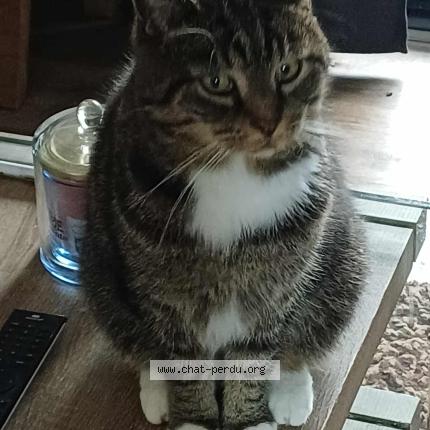 Chat tigré gris foncé ,bouts des pattes blanches , tache blanche doué la tête ! Âge 14 ans