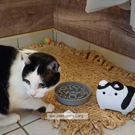 Notre chat Coco 2 ans et demi un oreil noir et autre blanc, il est noir et blanc , nez rose , pattes blanches et sa queux est noir